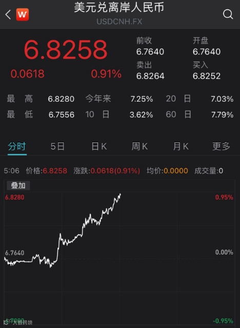 5月12日下午,美元兑离岸人民币冲破6.82,截至发稿最新报6.8203,日内跌约600点,刷新2020年9月以来新低。在岸市场上,中国货币网显示人民币兑美元汇率为6.7292,较今年以来最高点6.3014下跌6.79%。