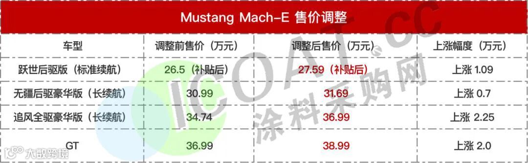 福特官方宣布,受汽车制造和原材料成本等大幅上涨因素,旗下Mustang Mach-E价格上涨0.7万元到2万元不等,新车将于5月5日起实施调整后售价。