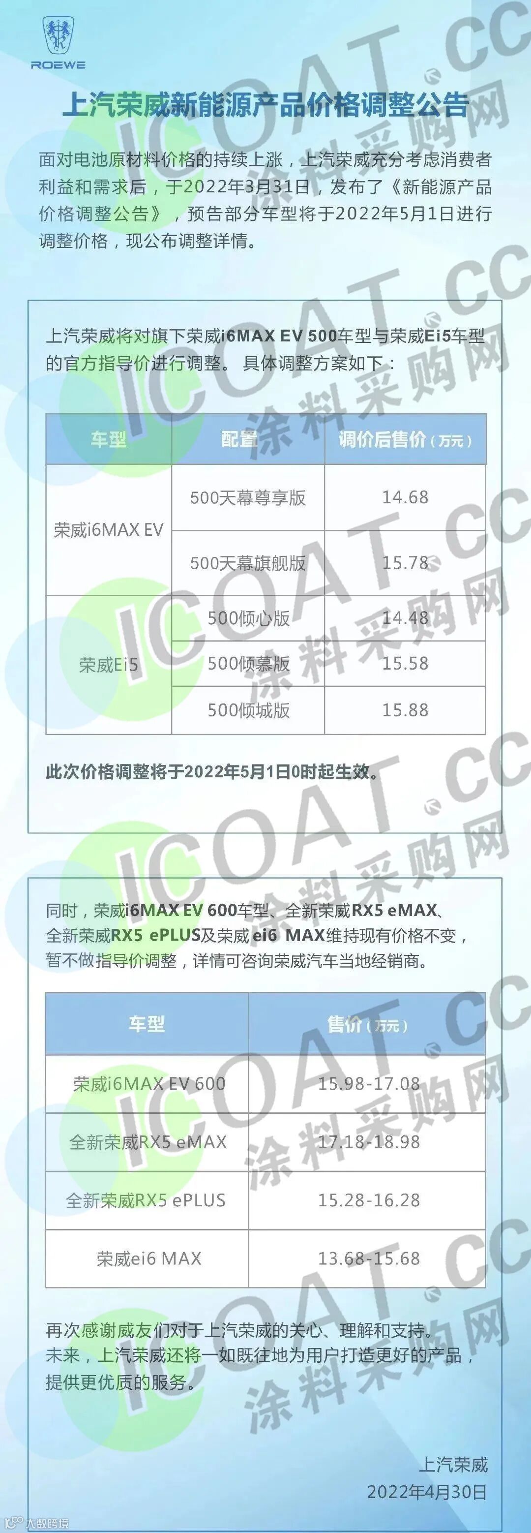 上汽集团决定将部分车型在5月1日进行调价,上汽飞凡汽车也于进入宣布涨价,受上游原材料价格上涨等因素影响,其针对旗下ER6、MARVEL R车型的指导售价进行调整,上涨3000-10000元不等。