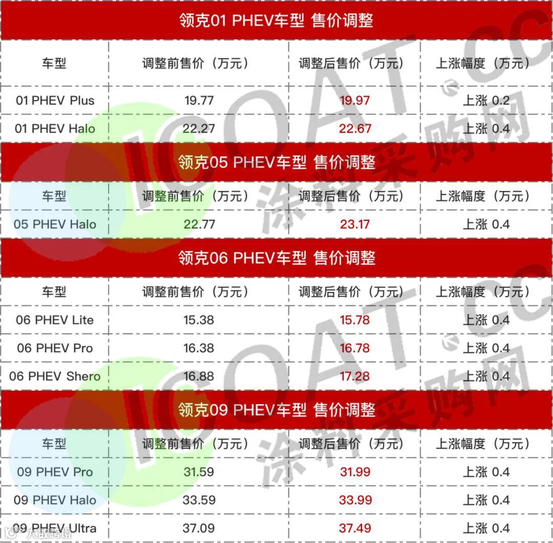 领克汽车官宣旗下在售PHEV插电混合动力车型价格上调,调整车型包括领克 01 PHEV、领克05 PHEV、领克06 PHEV、领克09 PHEV,上涨幅度在2000-4000元。