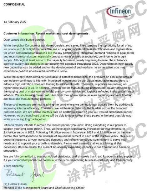 英飞凌表示,由于市场供不应求及上游成本的增加,英飞凌无力承担溢出的成本,酝酿涨价。