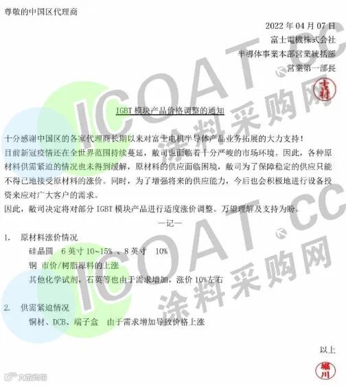 富士表示,各种原材料供需紧迫未得到缓解,原材料供应面临困境,为保障稳定供应只能不得已地接受原材料的涨价,也将对部分IGBT模块产品进行适度涨价调整。