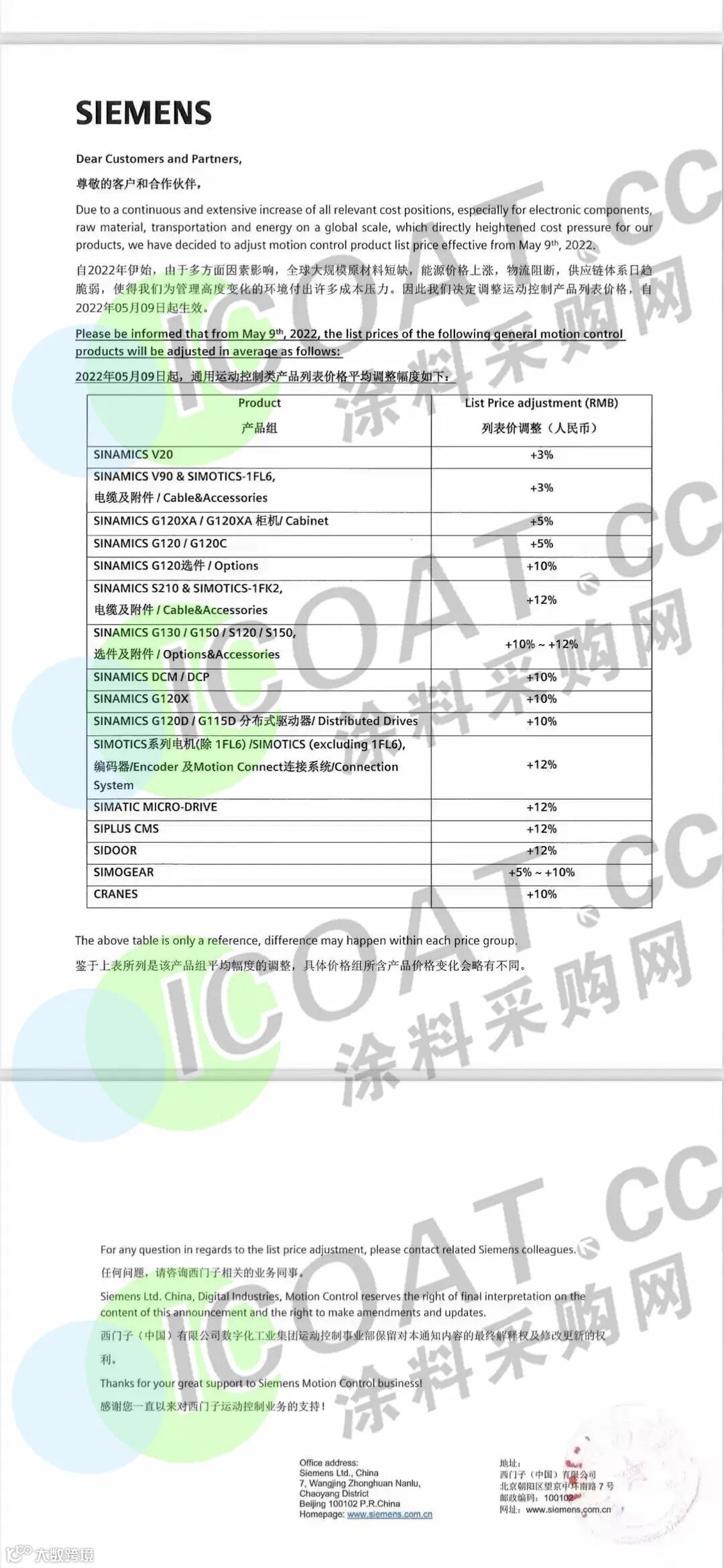 西门子发函称,5月9日起,部分产品价格上涨,最高涨幅为12%。