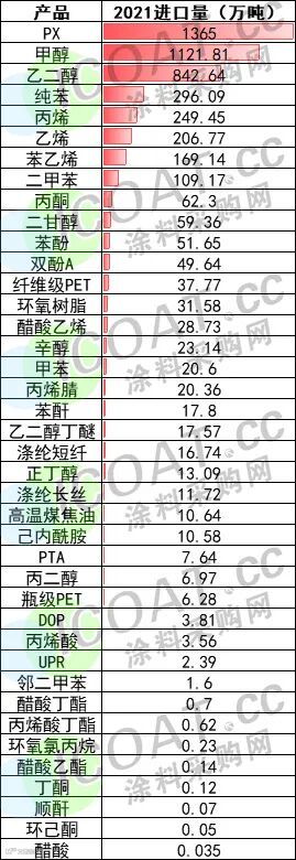 2021年我国氯化钾进口依赖度高达57.5%,MMA对外依存度超60%,年需求增长率高于10%。PX、甲醇等化工原料2021年进口量超过1000万吨,乙二醇、纯苯、丙烯、乙烯。苯乙烯、二甲苯等原材料2021年进口量在百万吨左右,另有十余种化工原材料依赖于海外进口。