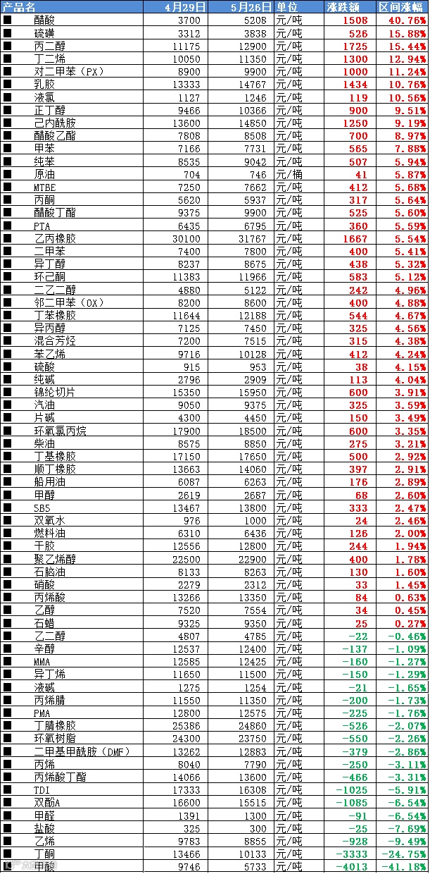 下图为广化交易监测的5月大宗商品涨跌一览表,本月大宗市场出现“大涨大跌”现象。4月29日到5月26日,共48个产品出现价格上涨,多个产品涨超10%,其中醋酸大涨1500元/吨,涨超40%!下跌产品共计19种,丁酮、甲酸出现大幅下跌情况,其中甲酸疯狂下跌4000元,下探超40%!