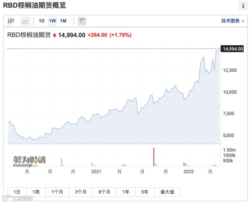 而受印尼棕榈油禁令的影响,国际棕榈油价格却在一路狂飙。4月以来,棕榈油期货价格累计涨幅接近24%,今年年内涨幅更是超过64%。另外,芝加哥商品交易所的豆油期货价格也创出历史最高价格。