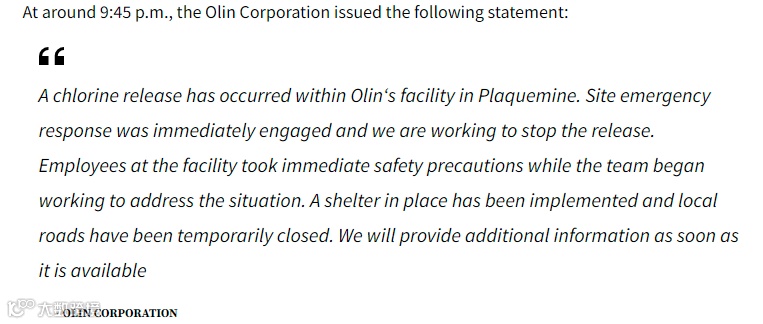 晚上9点45份,Olin公司也发布声明称,Olin在普拉克明的工厂发生了氯气泄漏,现场的应急响应已启动,工厂的员工也已采取了安全措施,公司正在努力阻止气体泄漏。