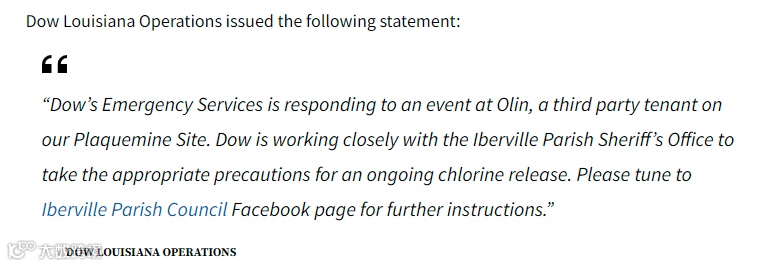 随后Dow Louisiana Operations发布紧急声明称,陶氏紧急服务部门正在积极响应发生在Olin的事件,Olin公司是我们在普拉克明地区的第三方租户。陶氏化学正与伊比维尔教区警长办公室密切合作,将采取适当的预防措施,以防止氯气的持续泄露。