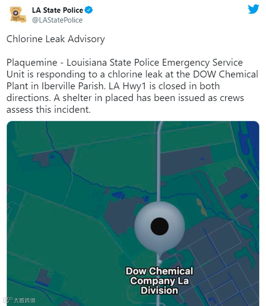 此外,4月19日上午10点23份,当地警方发布消息称,普拉克明-路易斯安那州警察紧急服务部门正在对伊比维尔教区陶氏化学工厂的氯泄漏做出反应。已向工厂附近地区居民发出“紧急避难”通知,并关闭了工厂附近的路易斯安那州1号高速公路的双向车道。