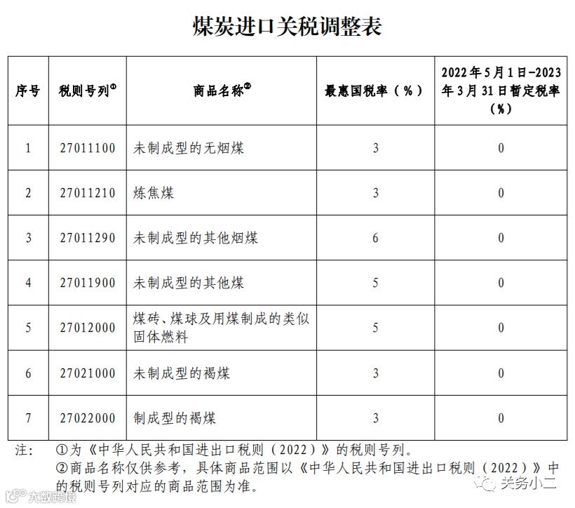 为加强能源供应保障,推进高质量发展,国务院关税税则委员会按程序决定,自2022年5月1日至2023年3月31日,对煤炭实施税率为零的进口暂定税率。