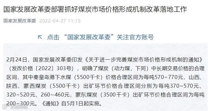 2月24日,国家发展改革委印发《关于进一步完善煤炭市场价格形成机制的通知》(发改价格〔2022〕303号),明确了煤炭(动力煤,下同)中长期交易价格的合理区间,其中秦皇岛港下水煤(5500千卡)价格合理区间为每吨570~770元,山西、陕西、蒙西煤炭(5500千卡)出矿环节价格合理区间分别为每吨370~570元、320~520元、260~460元,蒙东煤炭(3500千卡)出矿环节价格合理区间为每吨200~300元。《通知》自5月1日起实施!