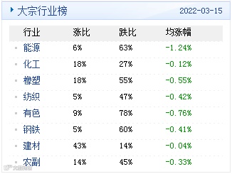 据全球化工价格监测,3月15日大宗商品价格涨跌榜中环比下降的商品共101种,集中在化工(共29种)和有色(共18种),跌幅在5%以上的商品主要集中在能源板块;跌幅前3的商品分别为WTI原油(-5.78%)、异丁醛 (-5.58%)、Brent原油(-5.12%)。