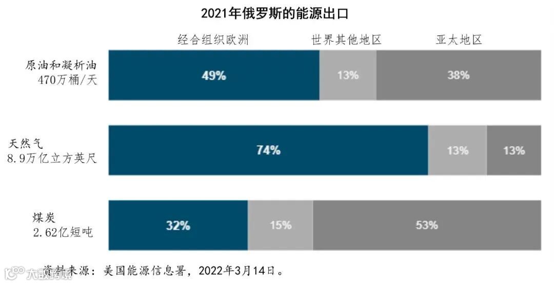 2021年,俄罗斯的原油出口大部分流向了经合组织欧洲地区,几乎占据了俄罗斯能源出口的一半!欧洲对俄罗斯能源是持高度依赖的,一旦能源开始禁运,欧洲原油价格也将剧烈波动。
