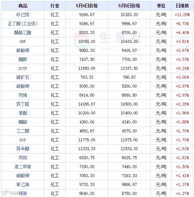 5月4日-5月5日 部分化工原材料价格变动表(单位:元/吨)