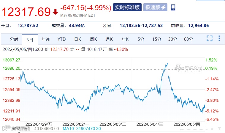 当地时间5月5日,美股三大指数集体走低,道指开盘狂泄超千点。截至收盘,三大指数全部回吐本周以来的所有涨幅。道指收跌3.12%,标普500指数收跌3.56%,纳指收跌4.99%,三大指数创下了近两年来最大单日跌幅。