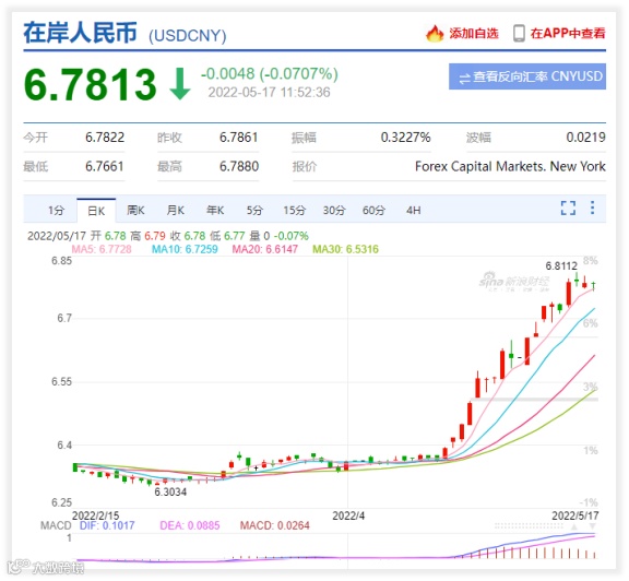 5月12日下午,美元兑离岸人民币冲破6.82!
