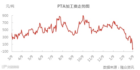 截止 3 月 9 日,PTA 加工费压缩至 -13 元/吨,核算上醋酸成本,加工费将压缩至 -160 元/吨上下。PTA 加工费的大幅压缩一方面由于国际
