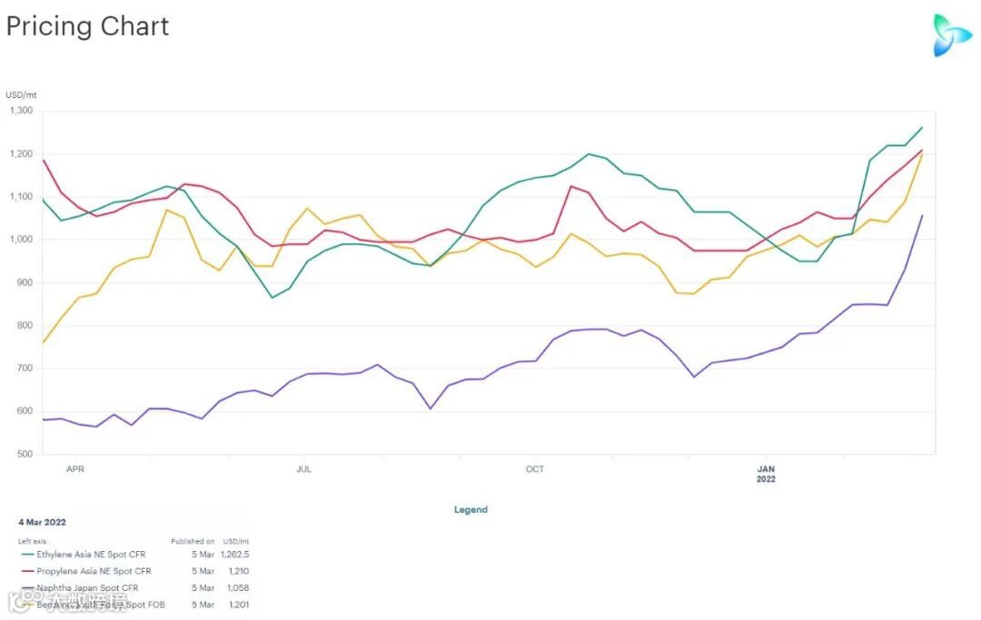 据统计,亚洲石化生产的主要原料石脑油的平均价格在一个月内飙升了40%以上,创下2008年以来的新高。3月10日亚洲乙烯市场价格如下: