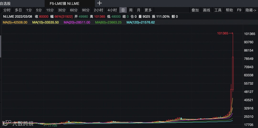 3月7日LME镍价创纪录单日大涨近90%后,3月8日再度发力,最高升破10万美元/吨关口,日内涨幅扩大至110%,刷新历史新高。