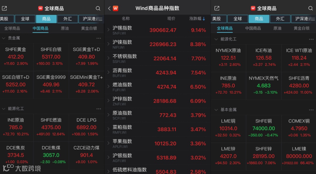 沪镍、沪锡、不锈钢、沥青主力合约涨停,燃油涨超12%。