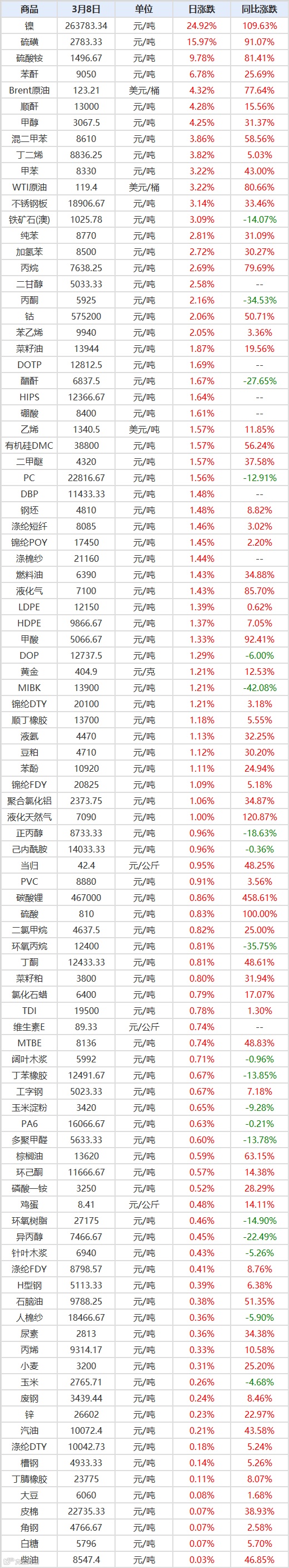 3月8日96种大宗商品价格环比上涨