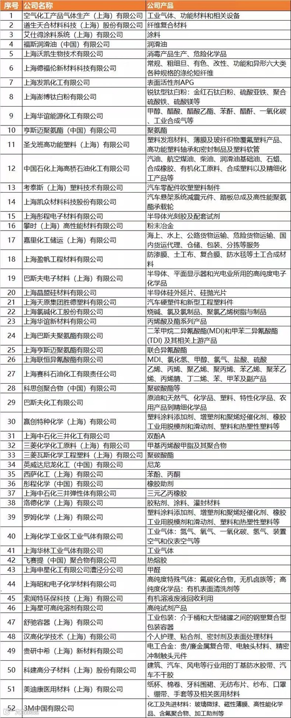 第一批重点企业“白名单”中,有50+家化工企业赫然上榜,其中包含巴斯夫、三菱化学、英威达、亨斯迈、赢创、科思创、罗姆化学等多家原材料生产企业,中国石化、中海油等上游石化厂,汽车零配件等下游塑料制品企业,以及工业气体、化工储运等配套企业。