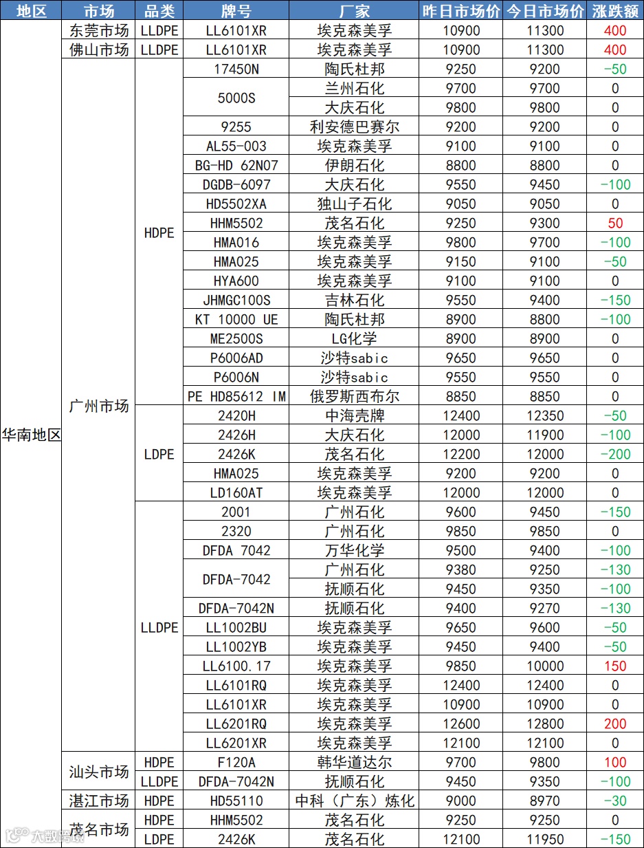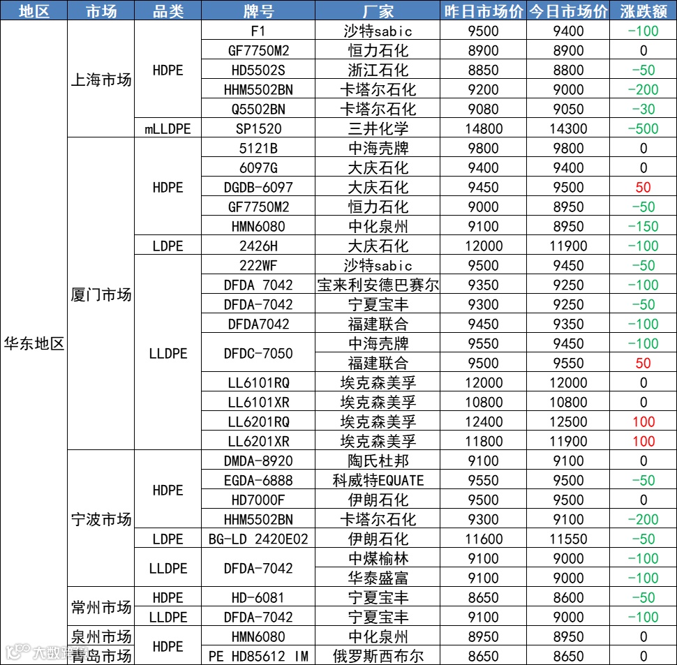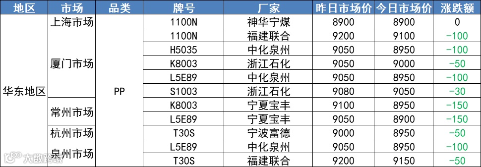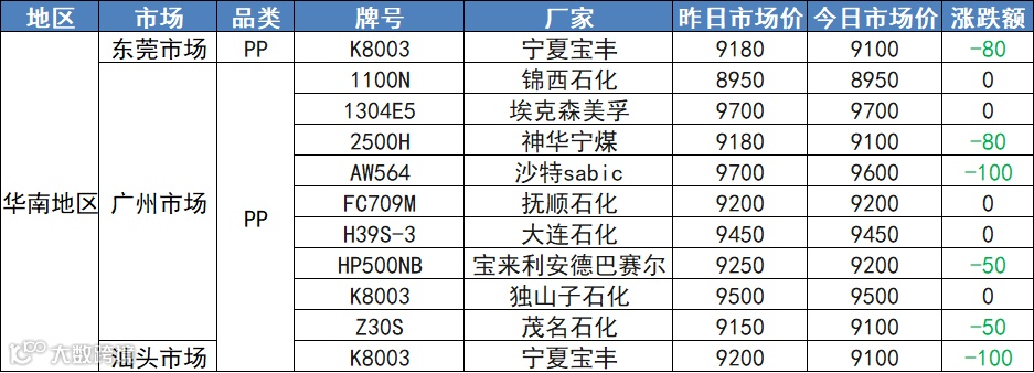 3月25日华东、华南地区PP、PE市场价!市场惨绿,PP、PE普跌!PE下跌50-200,最高跌500!PP全线飘绿,跌50-150!