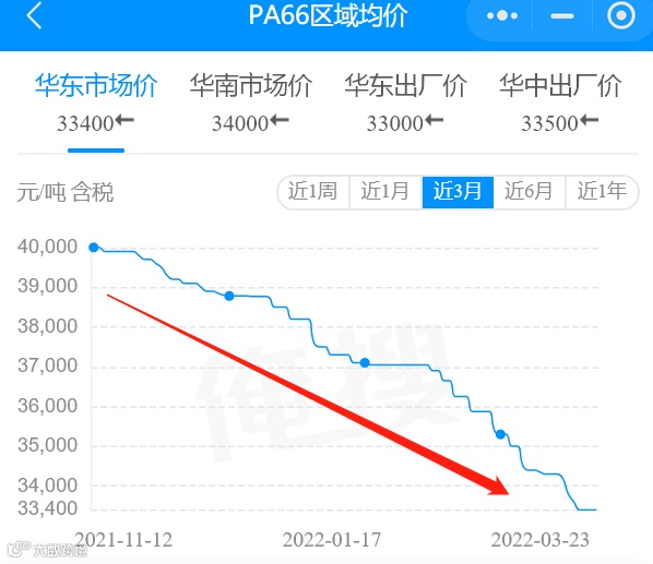 可以看出:自去年11月份,华东市场PA66主流牌号均价一路走跌,从当初的40000元/吨高位,跌破35000元/吨,截至目前市场主流牌号均价在33400元/吨左右!短短三个月的时间里跌近16.5%,一吨狂跌6600元!