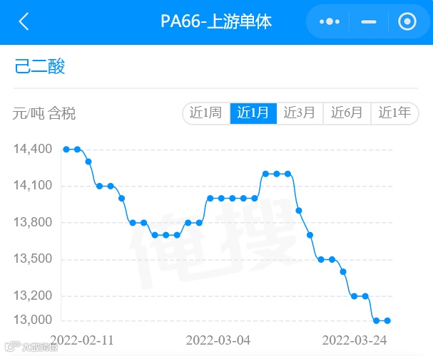 可以看出:近一月里,己二酸整体走跌,从2月中旬的14400元/吨跌至目前的13000元/吨,跌幅1400元/吨!受当前市场氛围清淡影响,下游询盘欠佳,贸易商心态走弱,让利出货,预计后续市场继续弱势走跌!