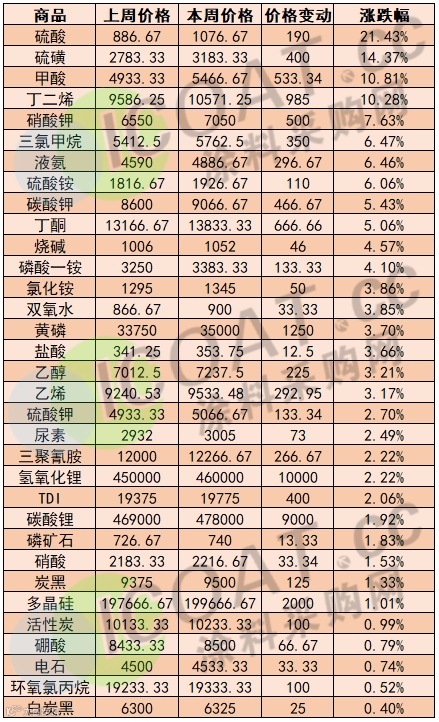 另外,不少化工品本周价格较前一周价格有所上涨,其中氢氧化锂周涨10000元/吨,多晶硅、碳酸锂吨价周涨超千元。