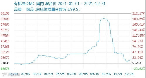 据数据统计显示,有机硅DMC出厂均价直破六万大关,参考63866元/吨,价格创造近十年历史新高,也创造了全年最大振幅达191%。