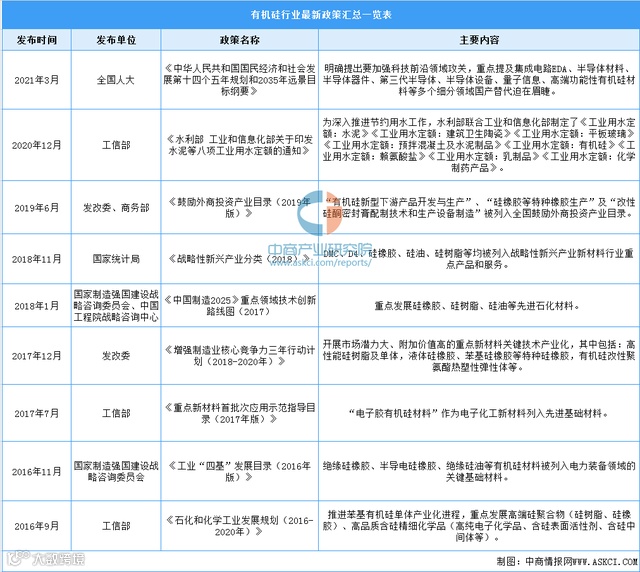 近几年来,国内有机硅市场受到了国家相关部门的重视及重点支持。国家陆续出台了多项政策,鼓励有机硅行业发展与创新为企业提供了良好的生产经营环境。具体情况列示如下: