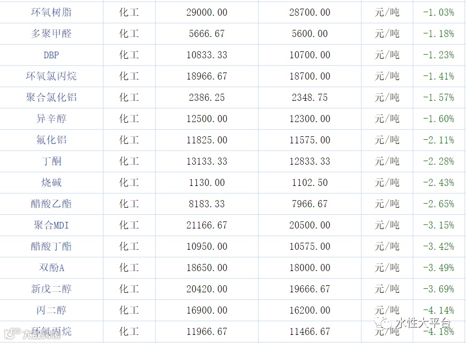 据生意社价格监测,环比下降的商品共有44种,跌幅在5%以上的商品共9种,占该板块被监测商品数的8.3%;跌幅前3的产品分别为环己酮(-9.97%)、异丁醛 (-9.79%)、碳酸二甲酯(-9.76%)。