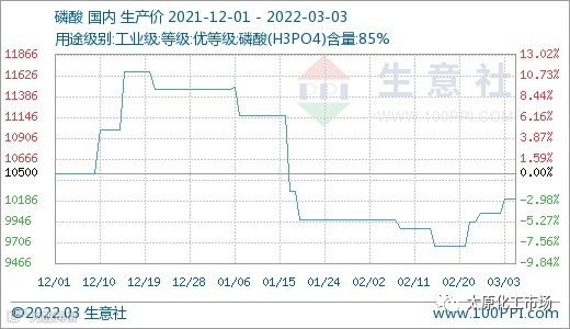 3月3日,磷酸市场价格10040元/吨,较前一日持平,同比上涨97.42%,目前原料黄磷价格上涨,成本面支撑力增强,但下游需求跟进缓故而抑制行情,截止目前,原料黄磷价格在38000-40000元/吨,磷酸市场价格在10000-12000元/吨左右。