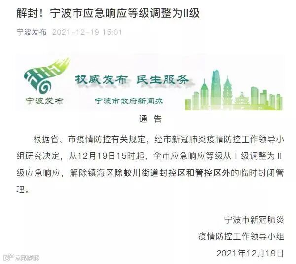 12月19日,宁波市举行新冠肺炎疫情防控工作新闻发布会,会上宣布自昨日15时起,全市应急响应等级从Ⅰ级调整为Ⅱ级应急响应,解除镇海区除蛟川街道封控区和管控区以外的临时封闭管理。