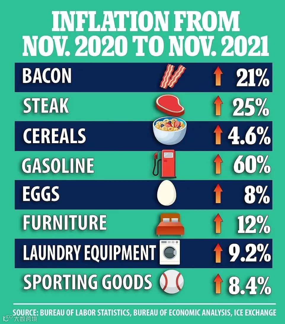 除了汽油价格飙升外,吃、住、用、行仍然在继续涨价。11 月份杂货总体同比上涨 6.2%。牛排上涨 25.6%,面包上涨 4%,新鲜水果上涨 5.8%。