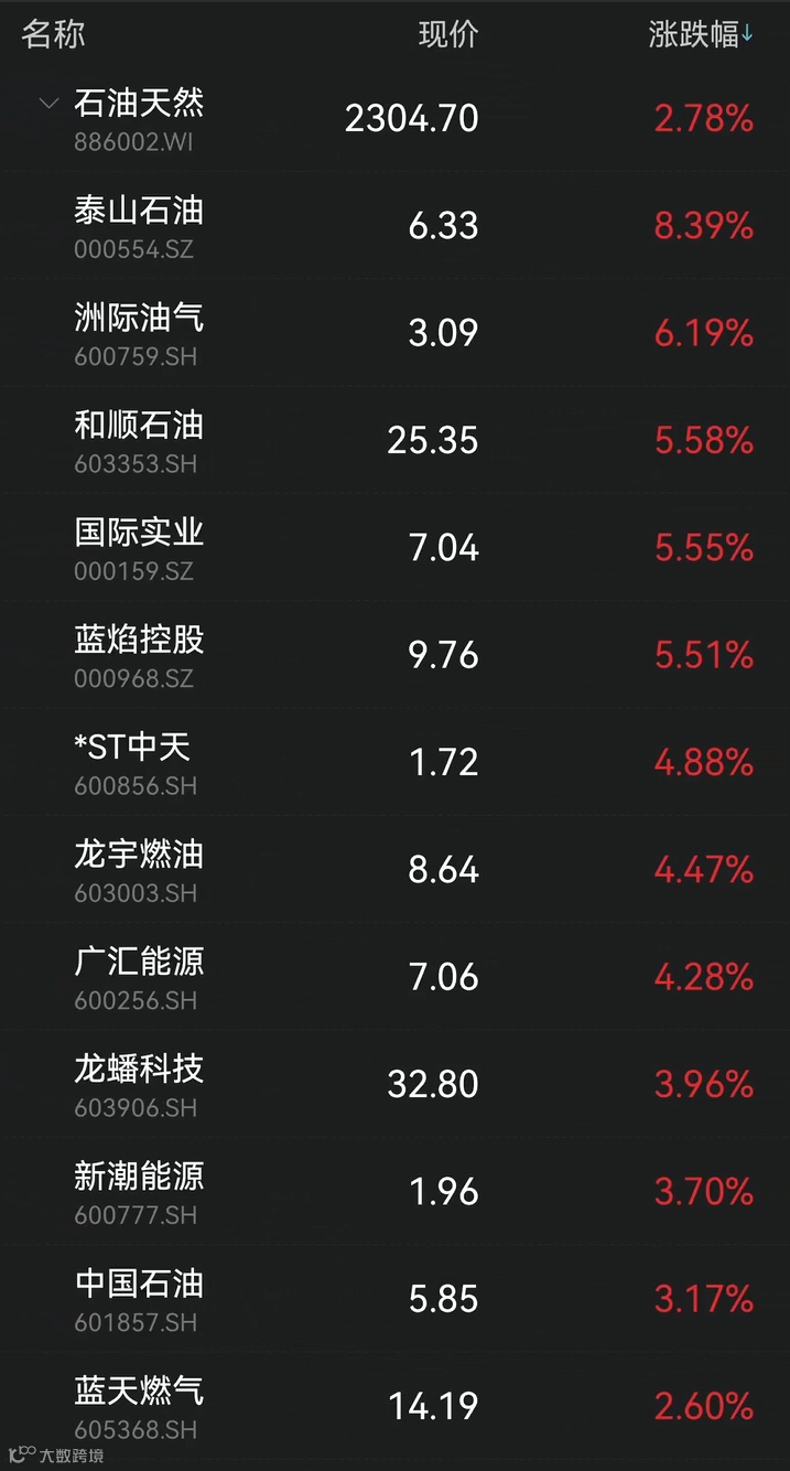 泰山石油涨超8%,和顺石油、龙宇燃油、新潮能源、中国石油等跟涨。