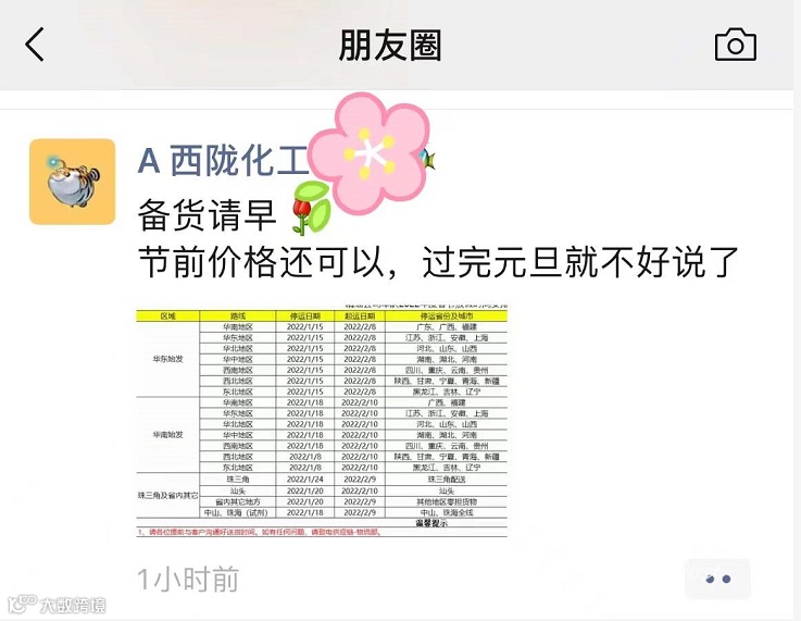 由于今年春节假期提前,加上疫情防控等因素,不少企业也已经提前放假。有料君在这里提醒各位化工老友,提前备货!