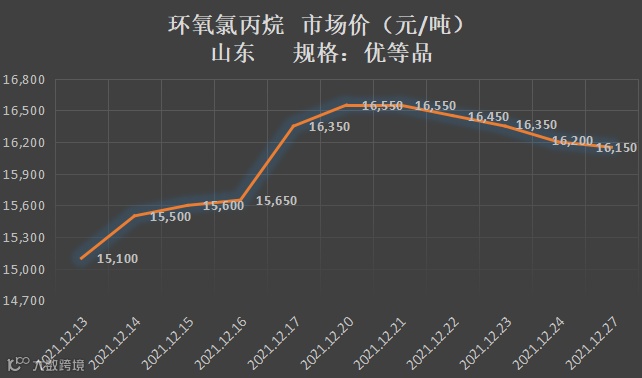 本周环氧氯丙烷市场高位僵持后略有走软。上周12月16日江苏一大厂装置突发故障停车带动市场价格大涨,厂家毛利均有明显好转,周内部分甘油法环氧氯丙烷装置重启,市场现货供应呈现增加趋势。