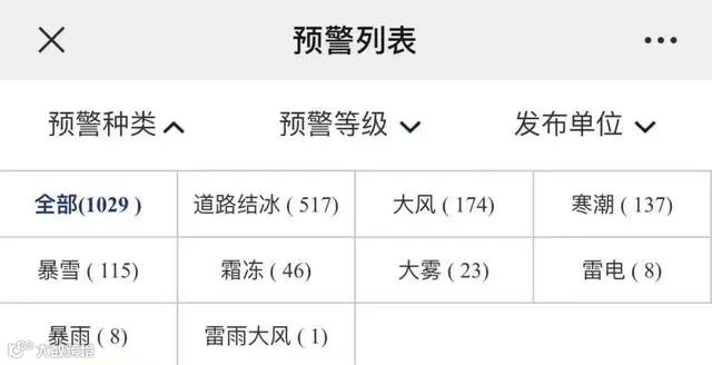 国家预警信息发布平台显示,截至发稿,全国共有1029个预警信息,其中道路结冰517个、寒潮137个、暴雪115个。