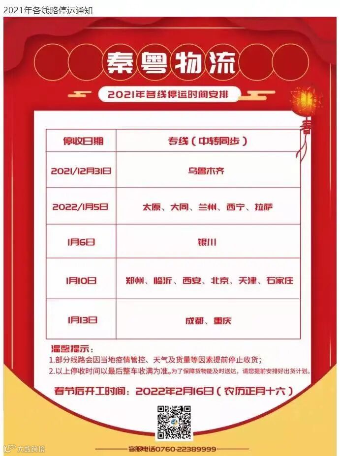 近日,秦粤物流发布《2021年各线路停运通知》:
