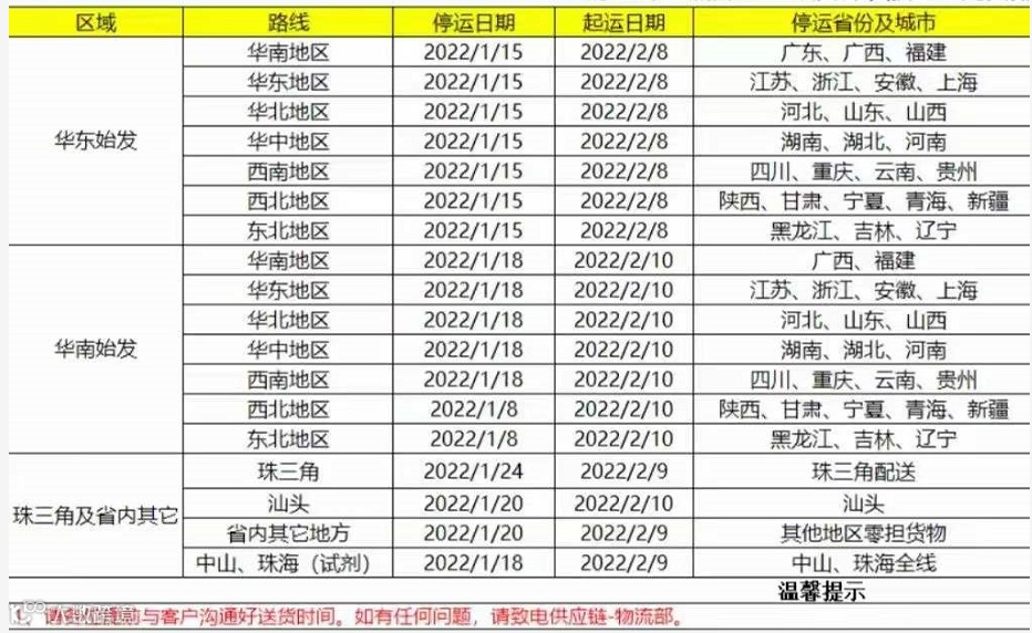 此外,秦粤物流还提醒,部分线路会因当地疫情管控、天气及货量等特殊情况提早停止收货。