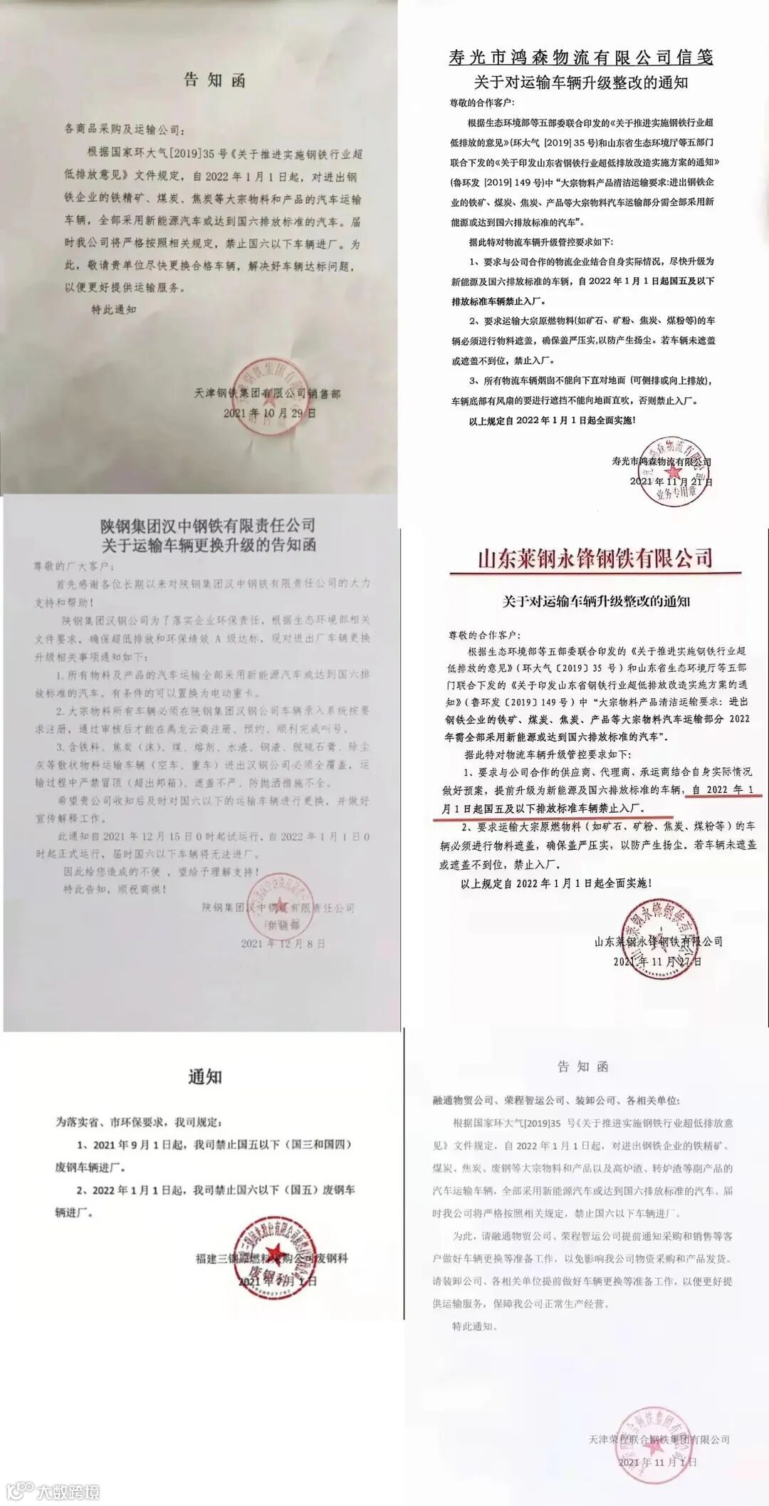 河北、河南、山东等地区均已出台针对国五柴油车的管控政策,不少工厂和企业禁止国五柴油车进厂装卸货。已有天津钢铁集团有限公司、山东莱钢永锋钢铁有限公司、天津荣程联合钢铁有限公司等多家钢企明确表示自2022年1月1日起,将禁止国五及以下排放标准车辆进入。