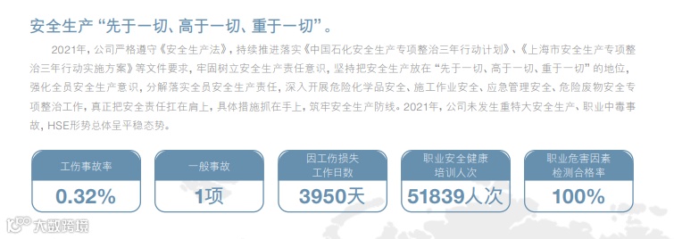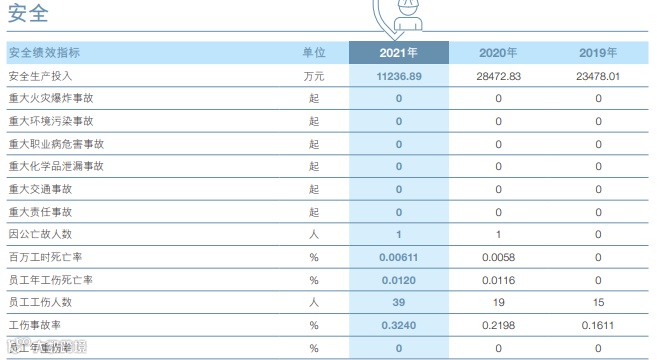 据上海石化披露的社会责任报告,2019~2021年,公司安全生产投入分别为23478万元、28472万元、11237万元,2021年同比下降60%。从2015年~2021年这7年间,公司重大火灾爆炸事故、重大责任事故等均为零。