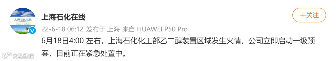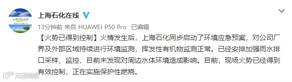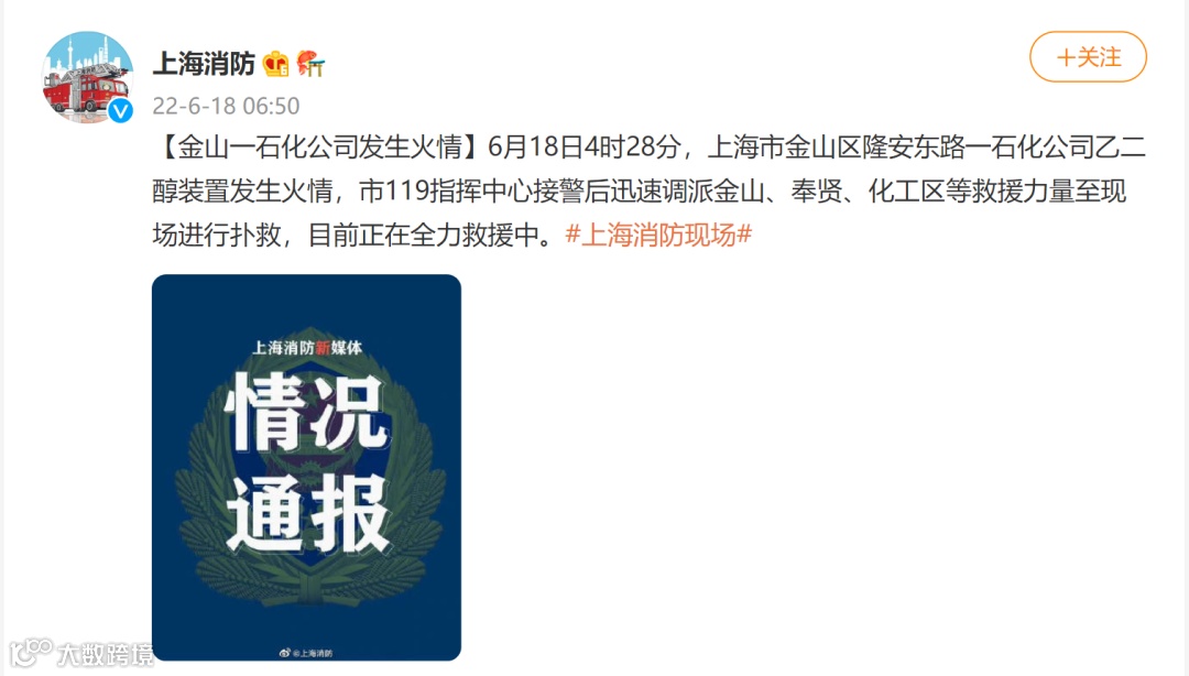 而就在昨天上海石化成立50周年纪念大会隆重召开,回顾总结上海石化50年来发展历程,展望上海石化发展美好前景。弘扬石油石化优良传统和“金山精神”,向着建设“国内领先、世界一流”能源化工及新材料公司的目标阔步迈进。今天还是上海石化50周年厂庆日,但在这个节骨眼儿上却发生了一起石化事故。