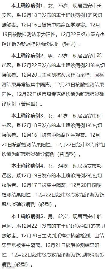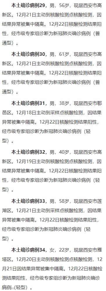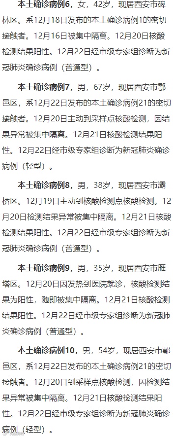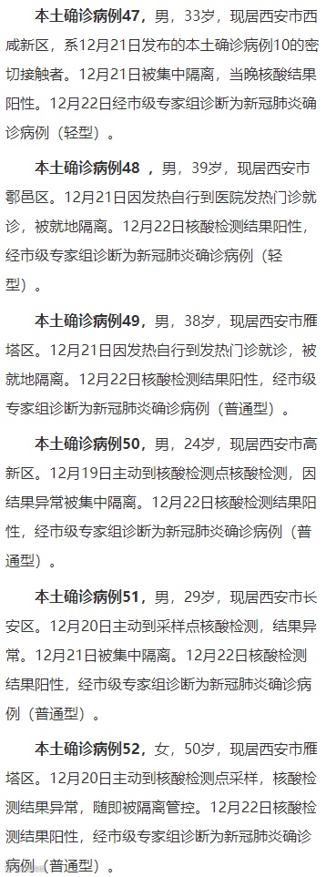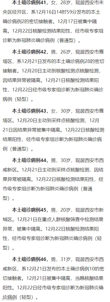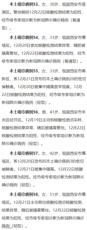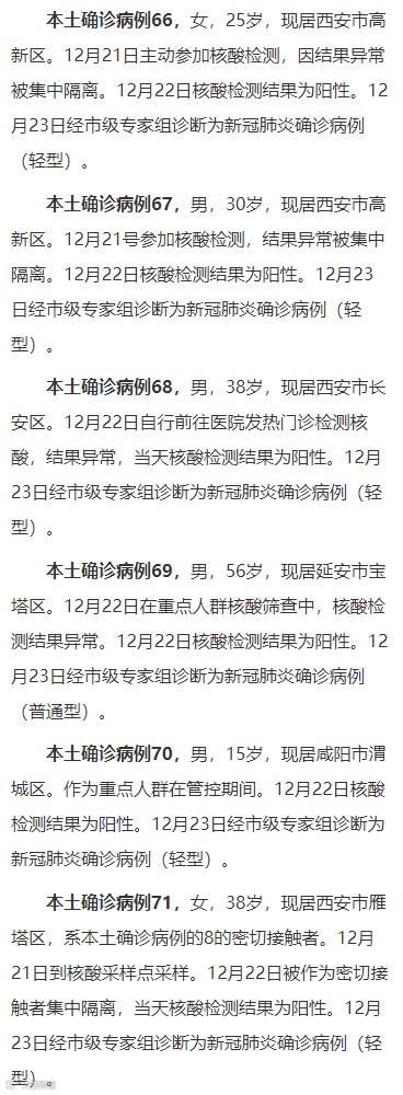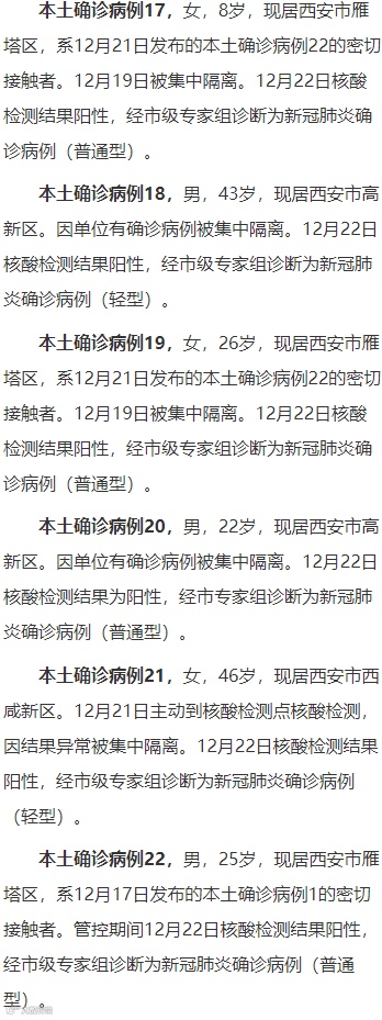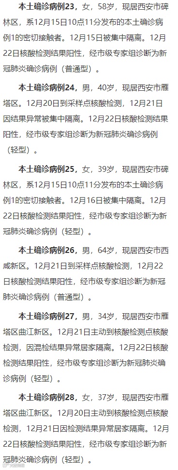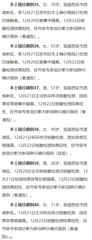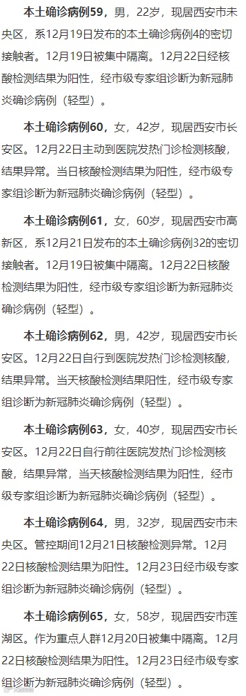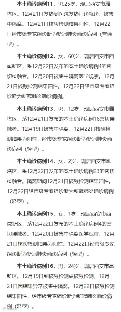 12月22日0时—23日8时,陕西新增报告本土确诊病例86例(西安市84例、咸阳市1例、延安市1例)。自12月9日以来,全省累计报告本土确诊病例235例(西安市227例、延安市4例、咸阳市4例)。