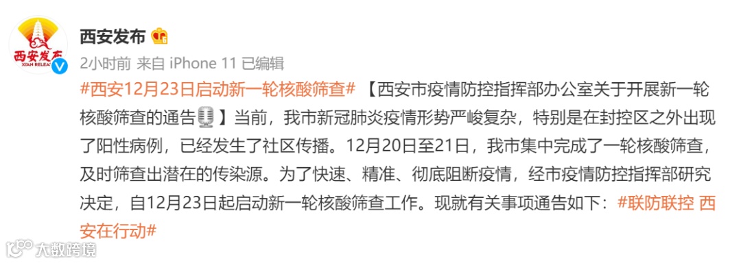 西安市决定自12月23日零时起实施疫情防控提级管理,全面加强管控措施,解除时间另行通知。