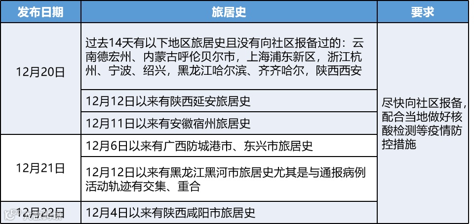 12月22日,广州疾控也紧急提醒,要求12月5日以来有黑河旅居史,12月6日有广西防城港旅居史,12月7日有天津旅居史,12月19日有河南沈丘旅居史的人员,所有穗康码为“红码”或“黄码”人员,尽快跟所在社区(村)、单位、宾馆主动报备。
