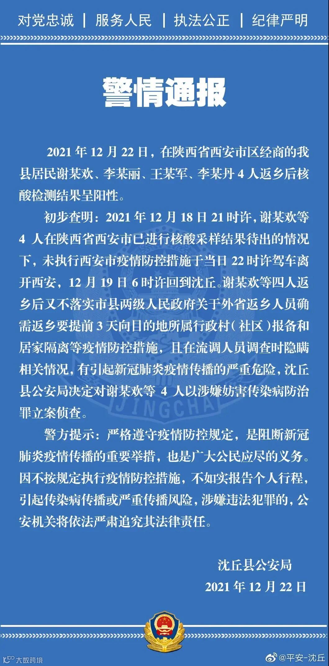 22日晚,沈丘县公安局发布通报,决定对谢某欢等4人以涉嫌妨害传染病防治罪立案侦查。