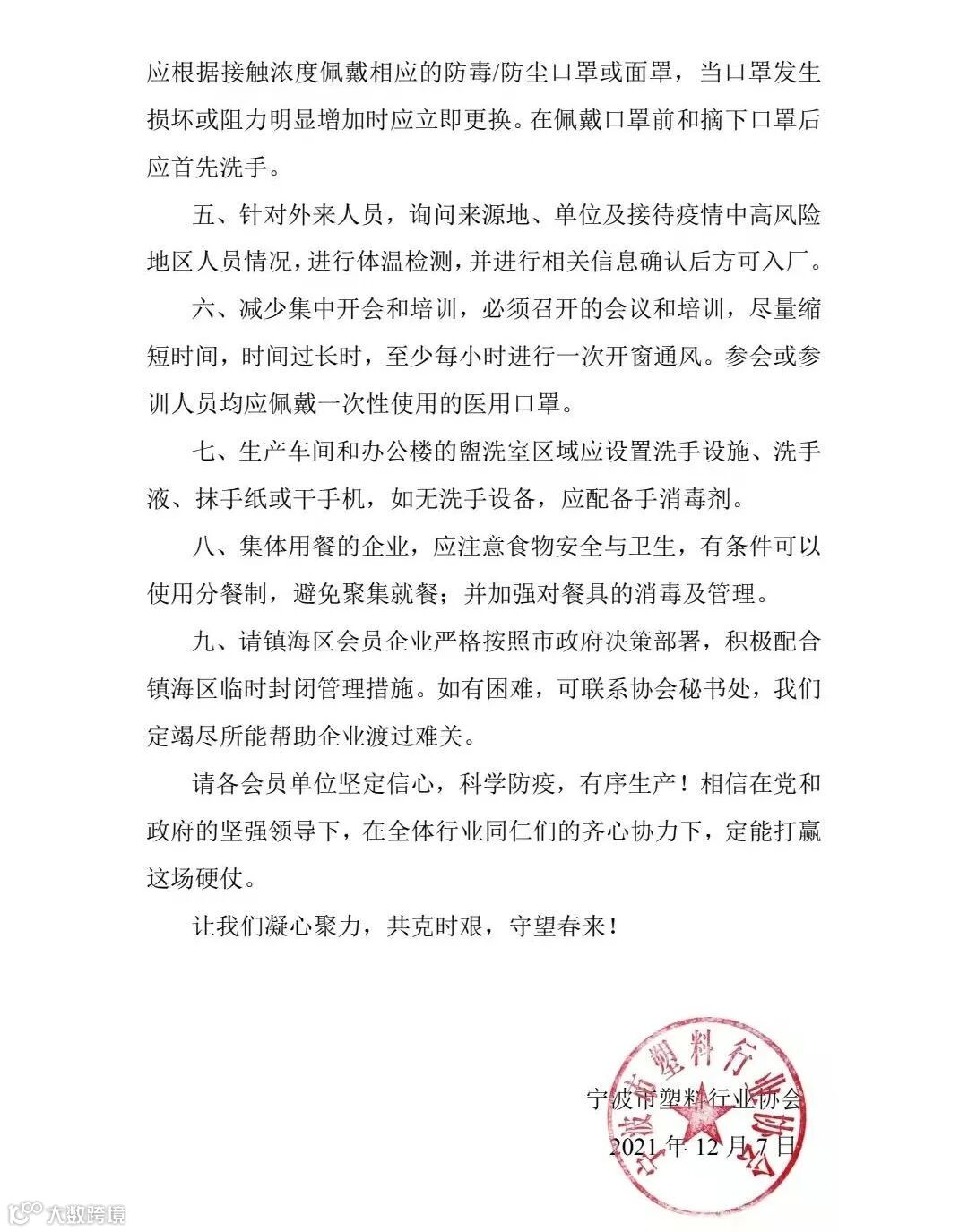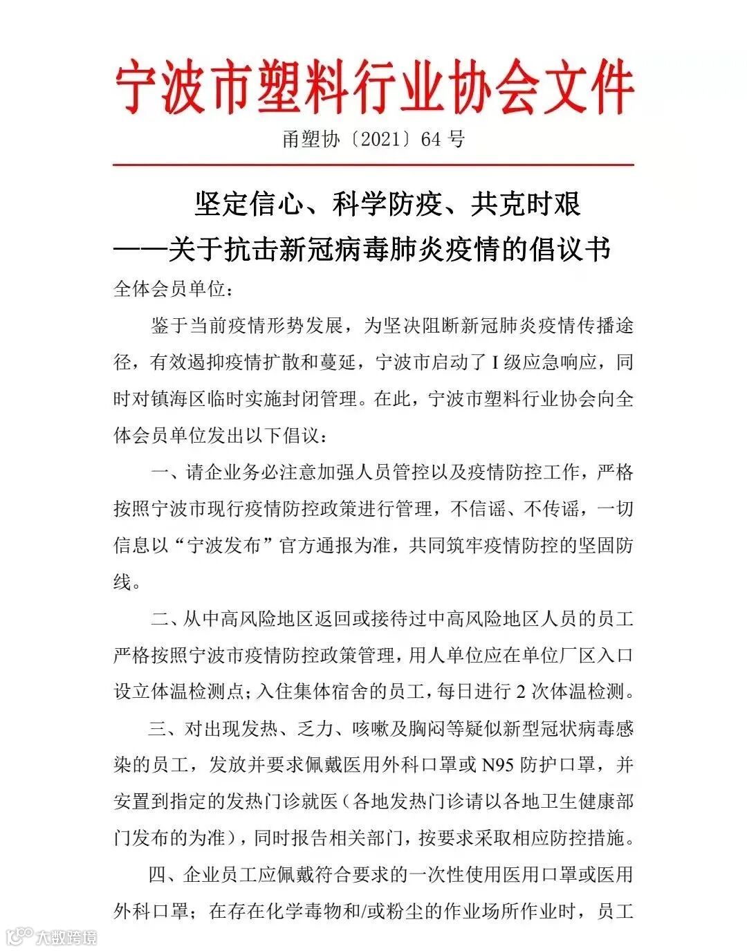 7日,宁波市塑料行业协会也发出倡议书,呼吁广大会员单位一起抗击新冠病毒肺炎疫情。